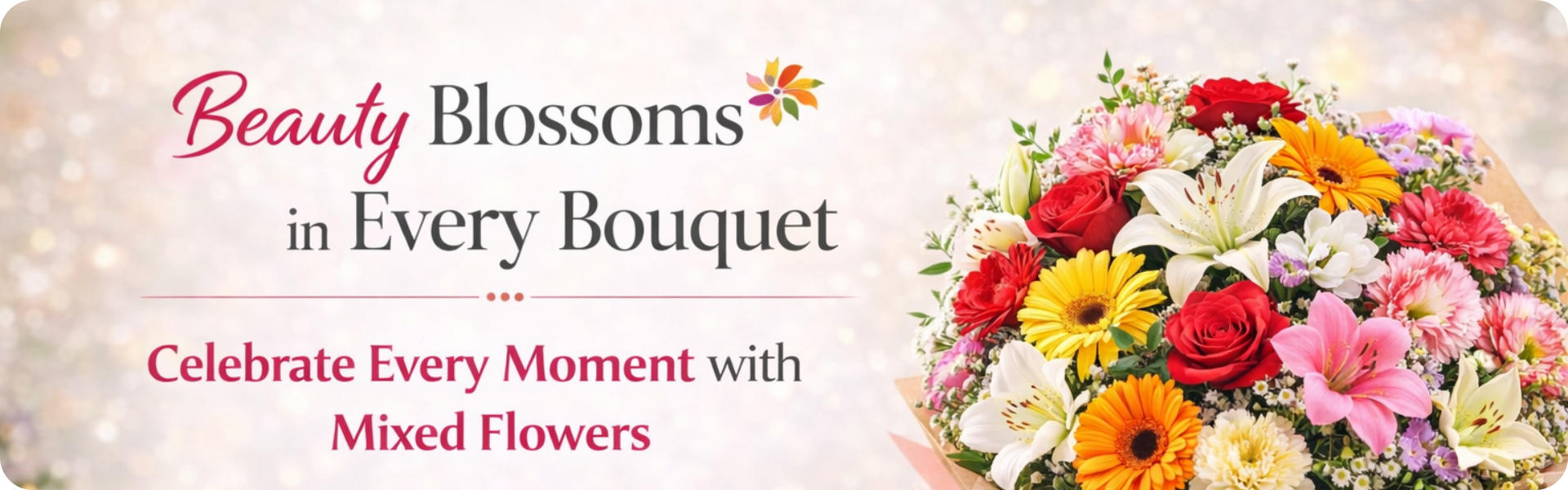 Mixed flower bouquets combine different fresh blooms into one vibrant arrangement. Suitable for every occasion and celebration. Same day mixed flower delivery available in Jaipur.