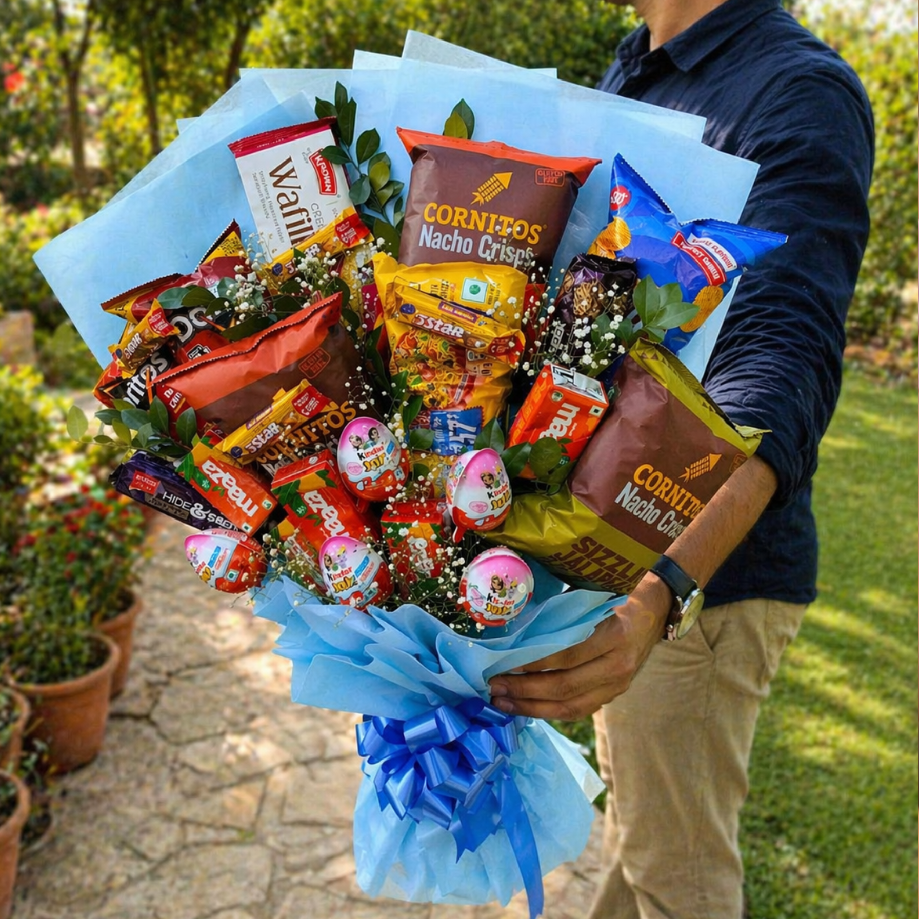 | A Special Bouquet of Snacks , Juices and Chocolates 3 Pkt of Cornitos Nachos 2 Pkt of Doritos Nachos 1 Pkt of Lays Chips 1 Pkt of Noodles 2 Pkt of Hide n shick Coockies 4 Pcs. of Mazza Mango Juice 5 Pcs. of Kinder Joy Chocolates 5 Pcs. of Five star Chocolates 1 Pkt of Waffer Heavy Wrapping with Sky Blue Paepr Garnishing with Baby breath flower