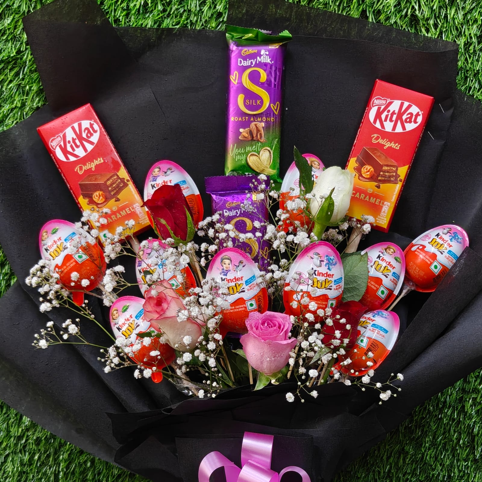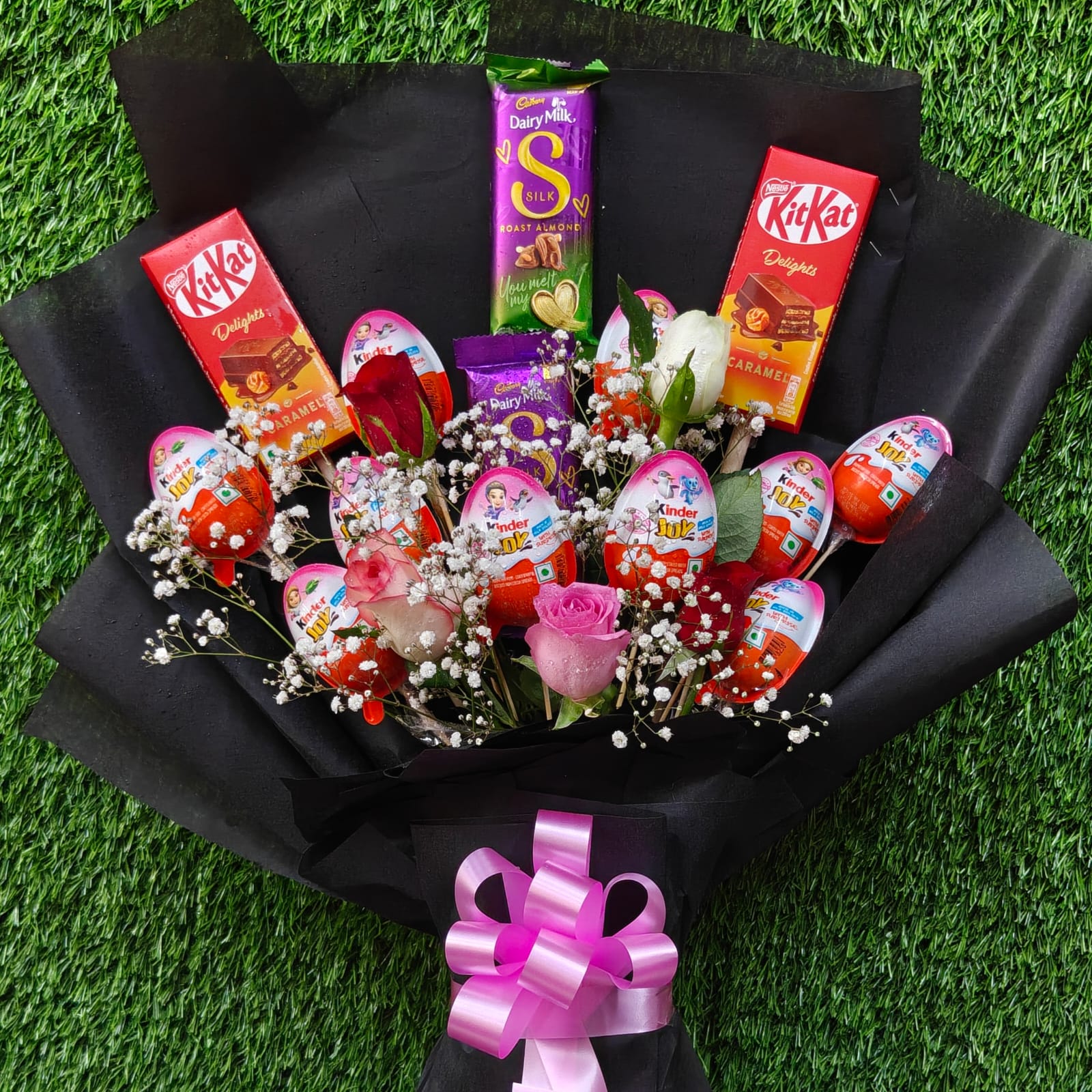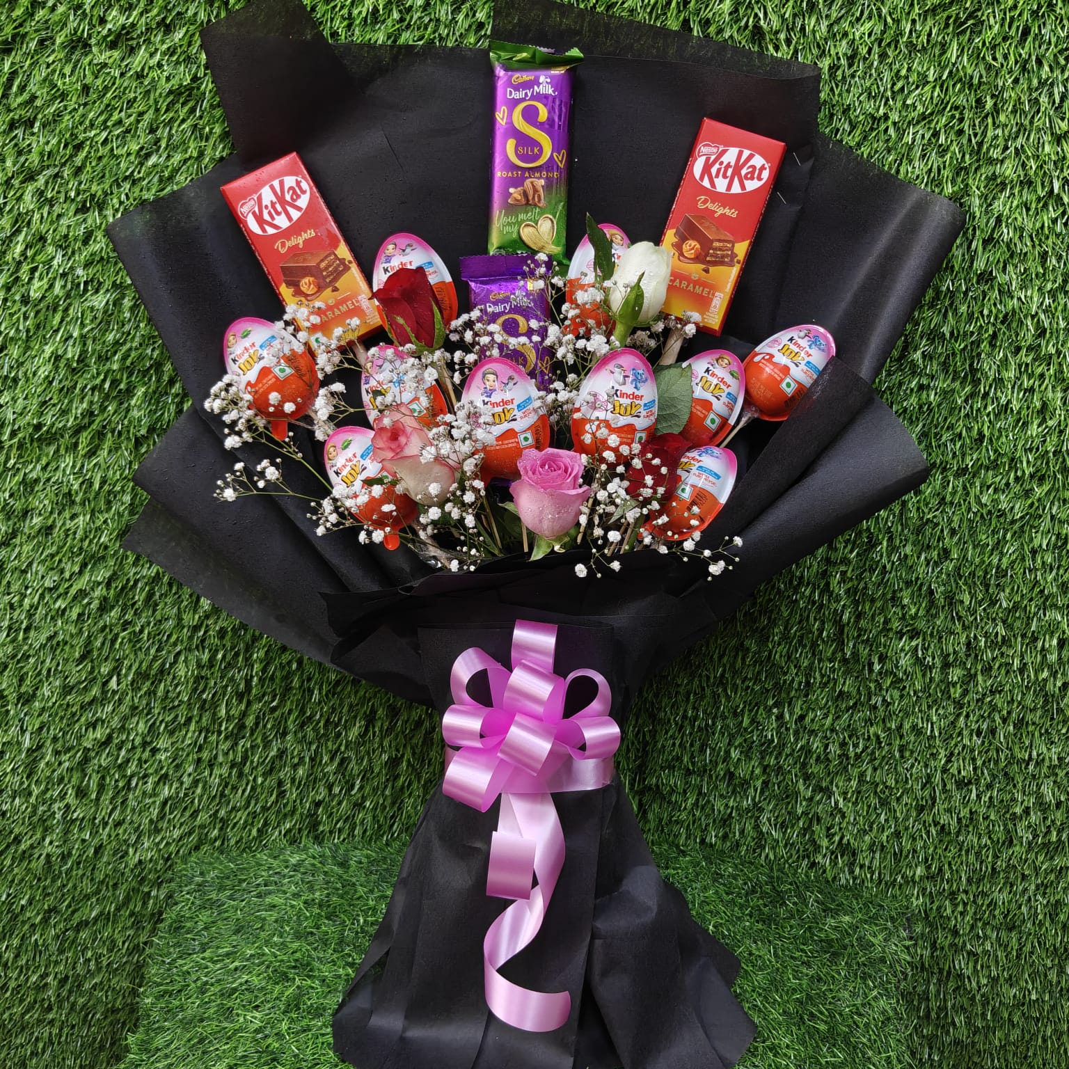| A Special bouquet of Chocolates with Flowers 2 pcs of kitkat chocolate 2 pcs of Cadbury silk chocolate 10 pcs of kinder joy chocolate 5 steams of mix roses Garnishing with Baby Breath Flower Designer Wrapping with Black tissue .