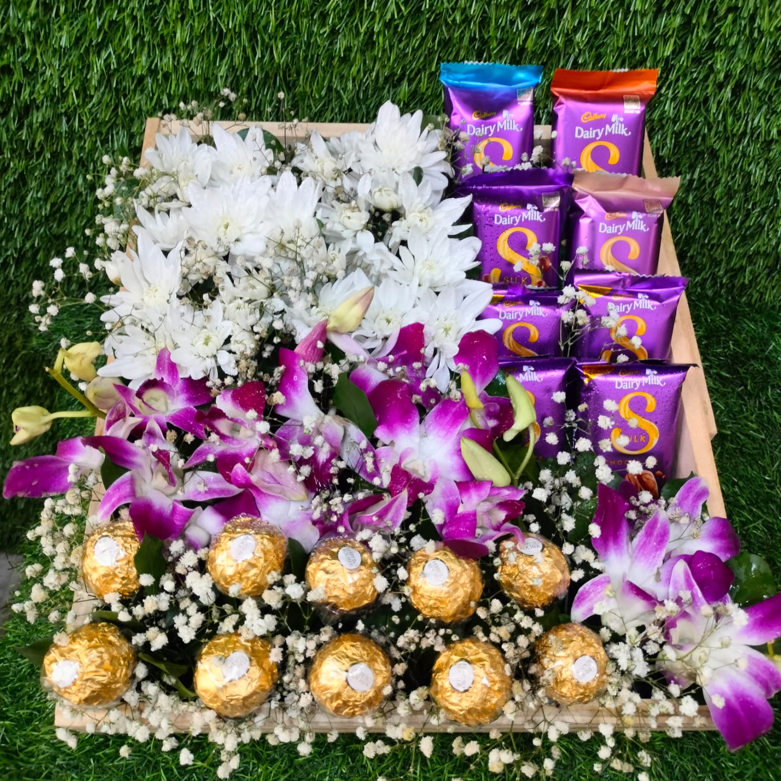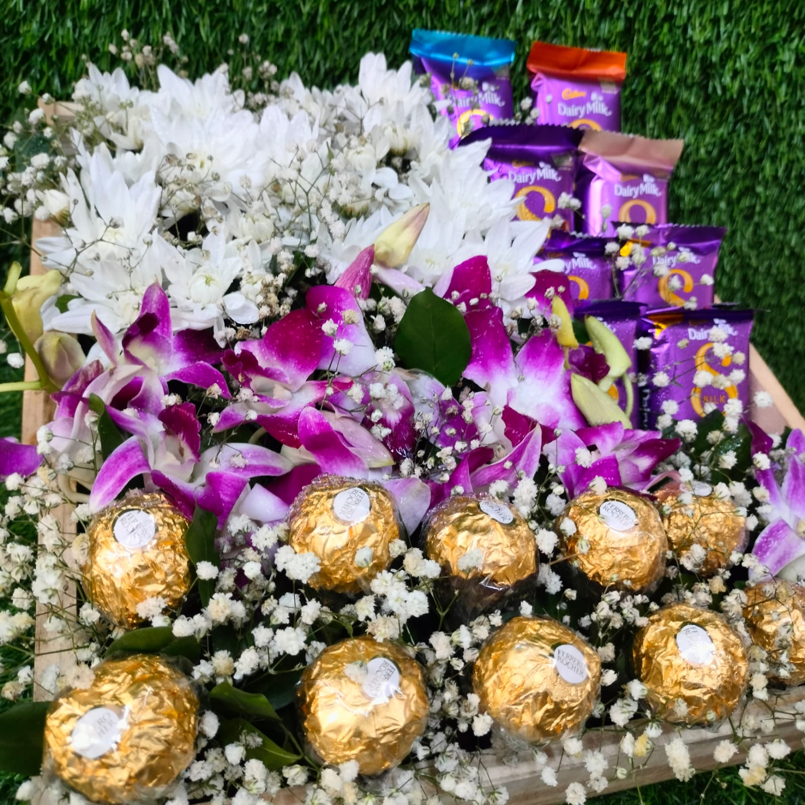 | A mix flower with chocolates wooden basket arrangement. 8 pcs of Cadbury dairy milk chocolate 10 pcs of Ferrero rochers chocolate 3 Steams of orchid flower 3 steams of daisy flower Additional fillers with Baby Breath Flower Bow With Flower Ribbon Reusable Round Designer wooden Basket