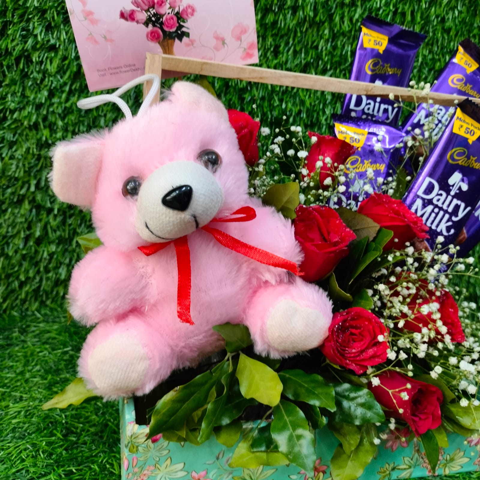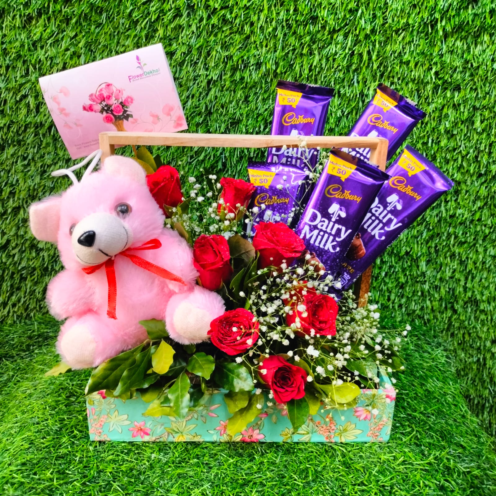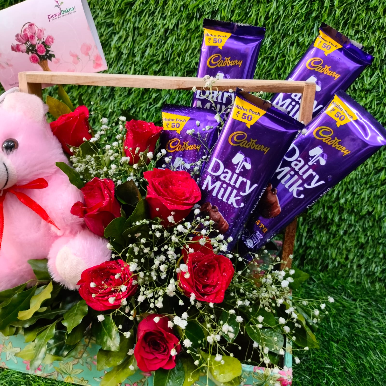| A mix flower with chocolates wooden basket arrangement. 8 steams of red rose 5pcs of Dairy milk chocolates 1 pcs of pink taddy bear Additional fillers with Baby Breath Flower Reusable Round Designer wooden Basket