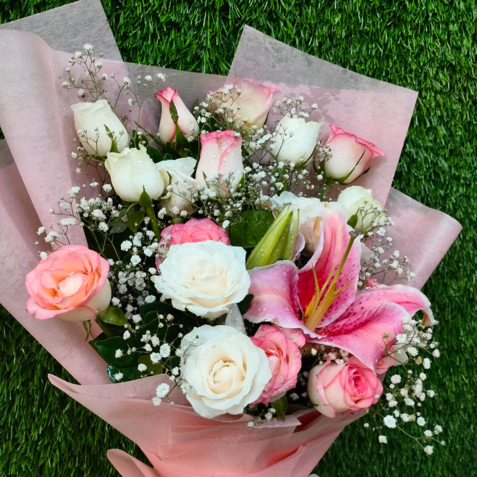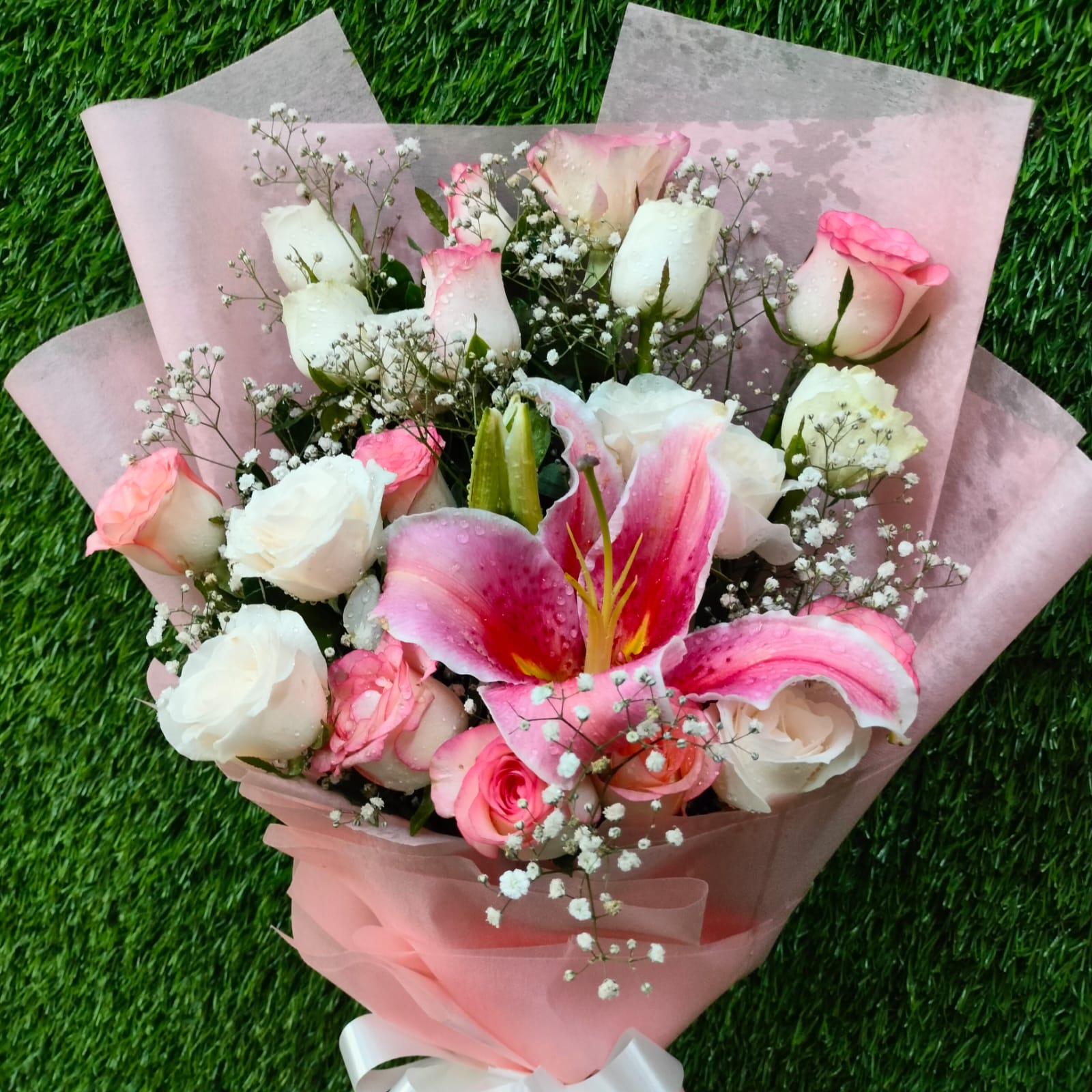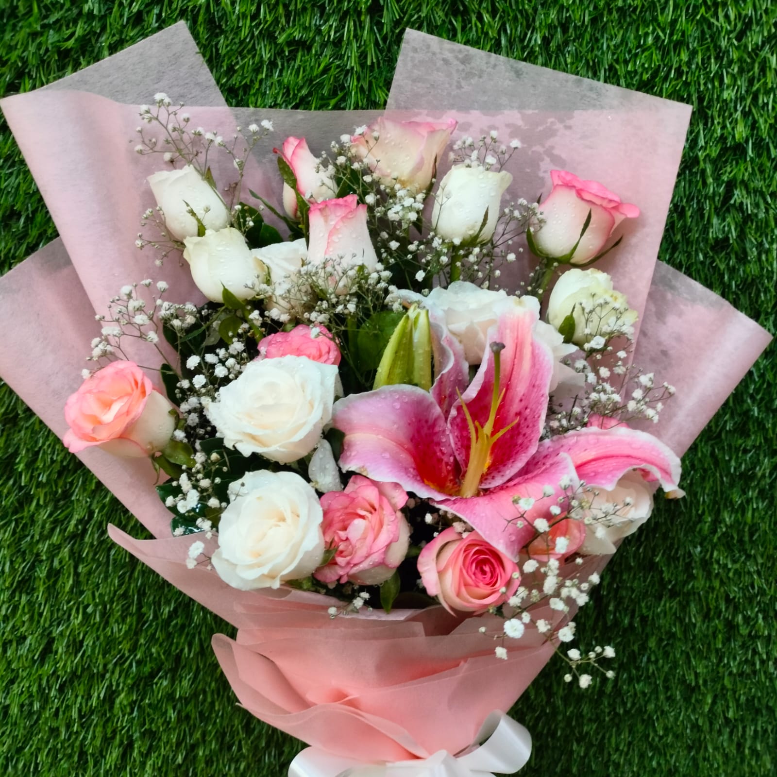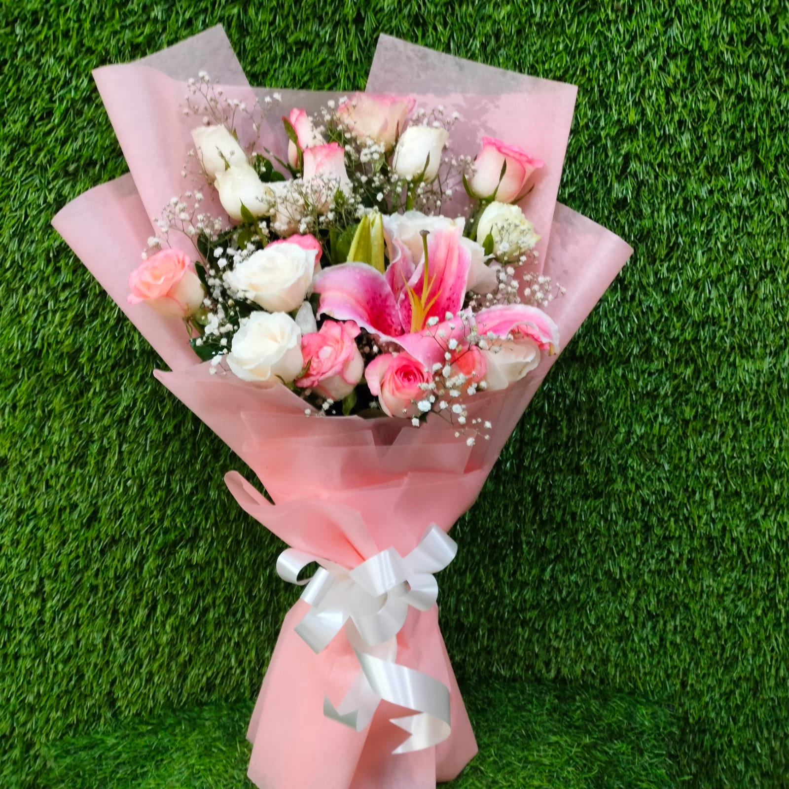 | A Bouquet of Exotic Flower 1 Steam of Lilly flower 20 Steams of mix roses Additional Flower With Baby Breath Wrapping with pink Tissue Paper Tai with flower Ribbon
