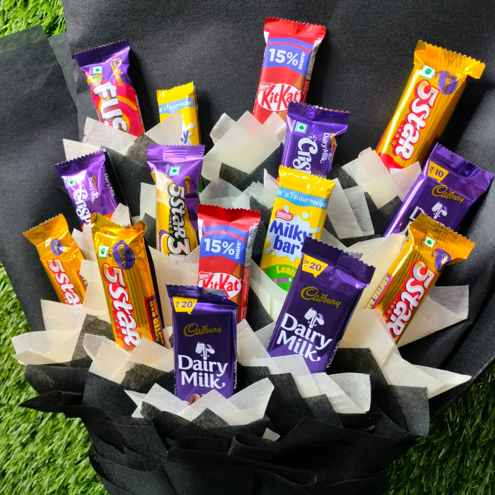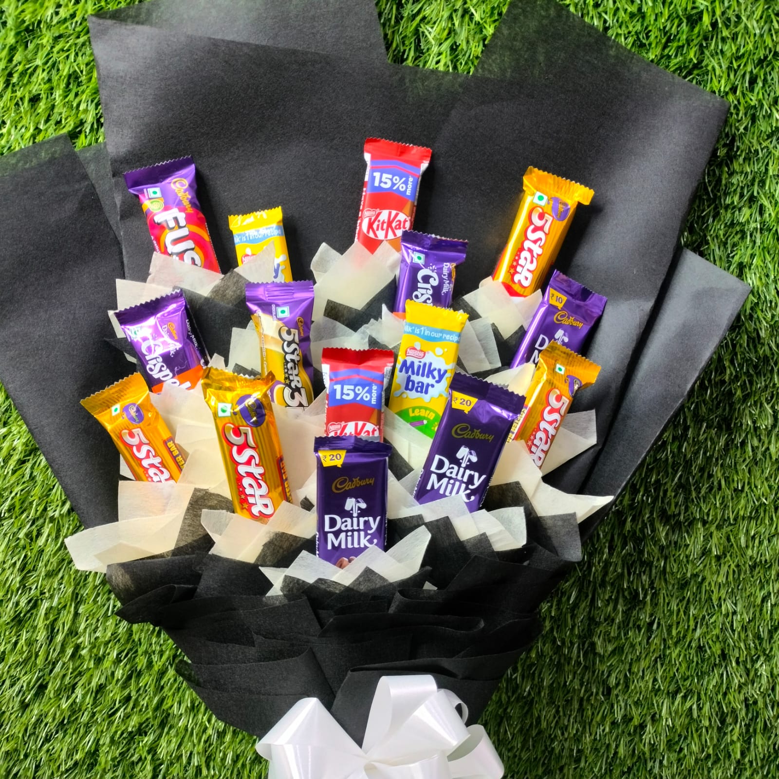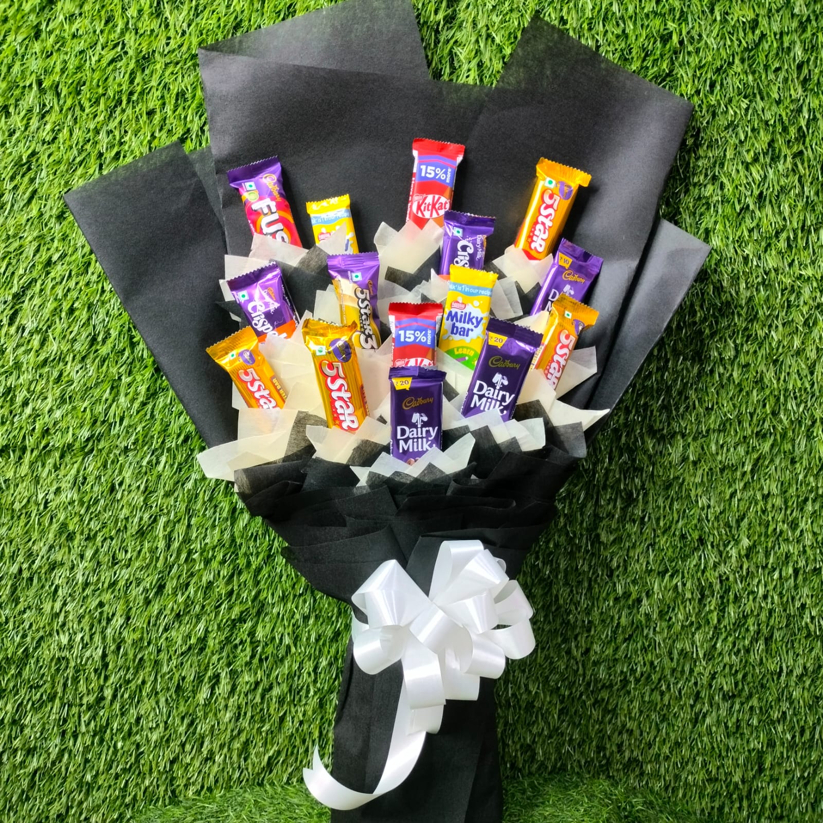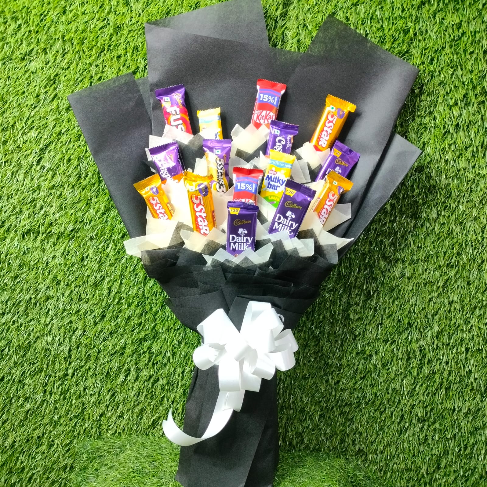 | A mix Chocolate Bouquet 3 Pcs of Cadbury Dairy milk Chocolate 6 Pcs of Cadbury Five Star Chocolate 2 Pcs of Kit kat Chocolate 2 Pcs of Milky Bar Chocolate 2Pcs of Cadbury Crispello Chocolate Important Heavy Wrapping Black & White Paper Bow With Flower Ribbon |