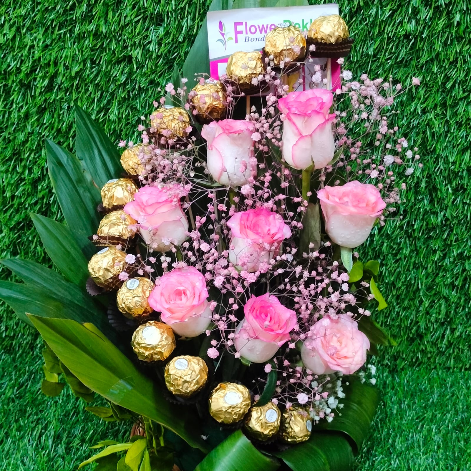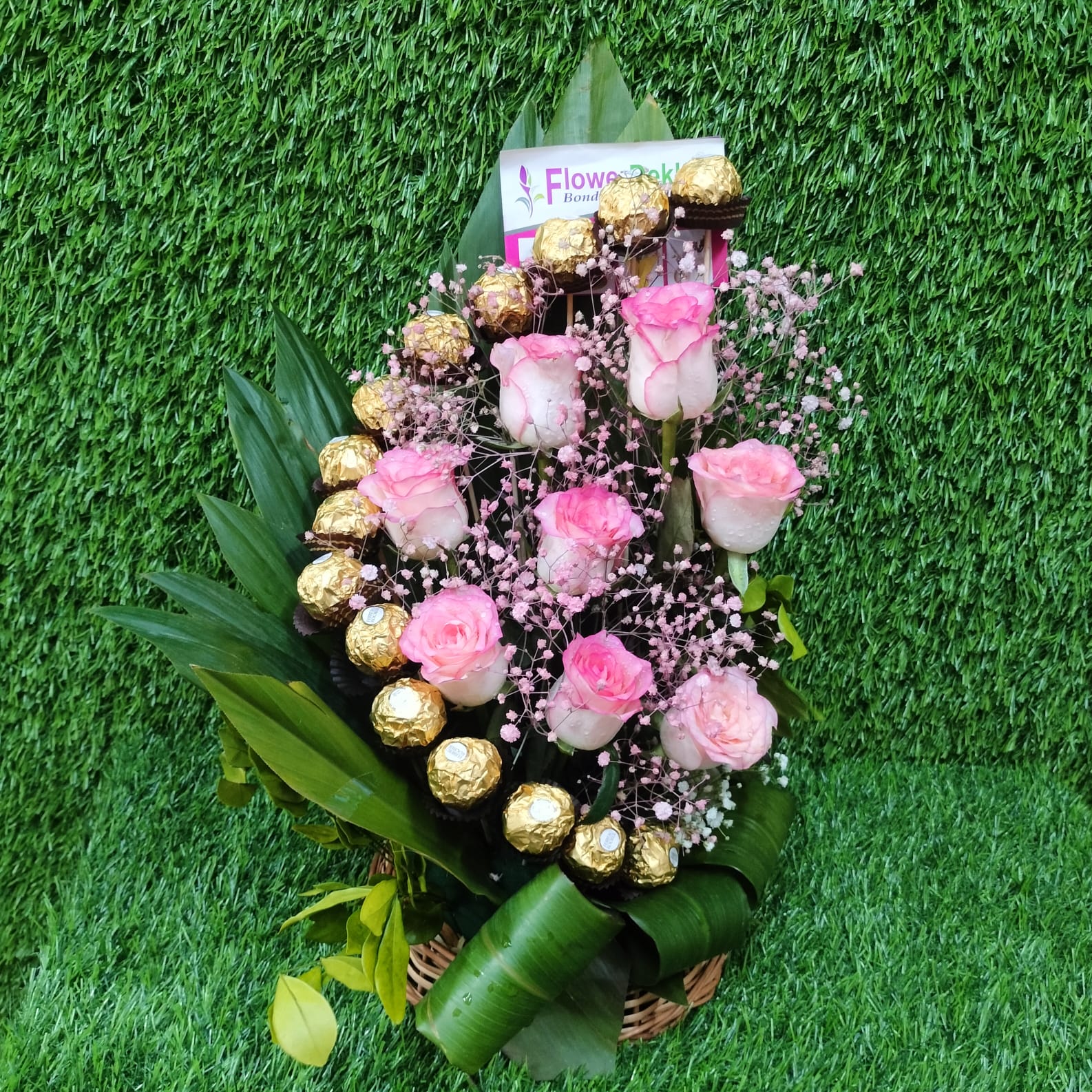 A Basket Arrangement Ferrero Rocher and Double Shaded Roses