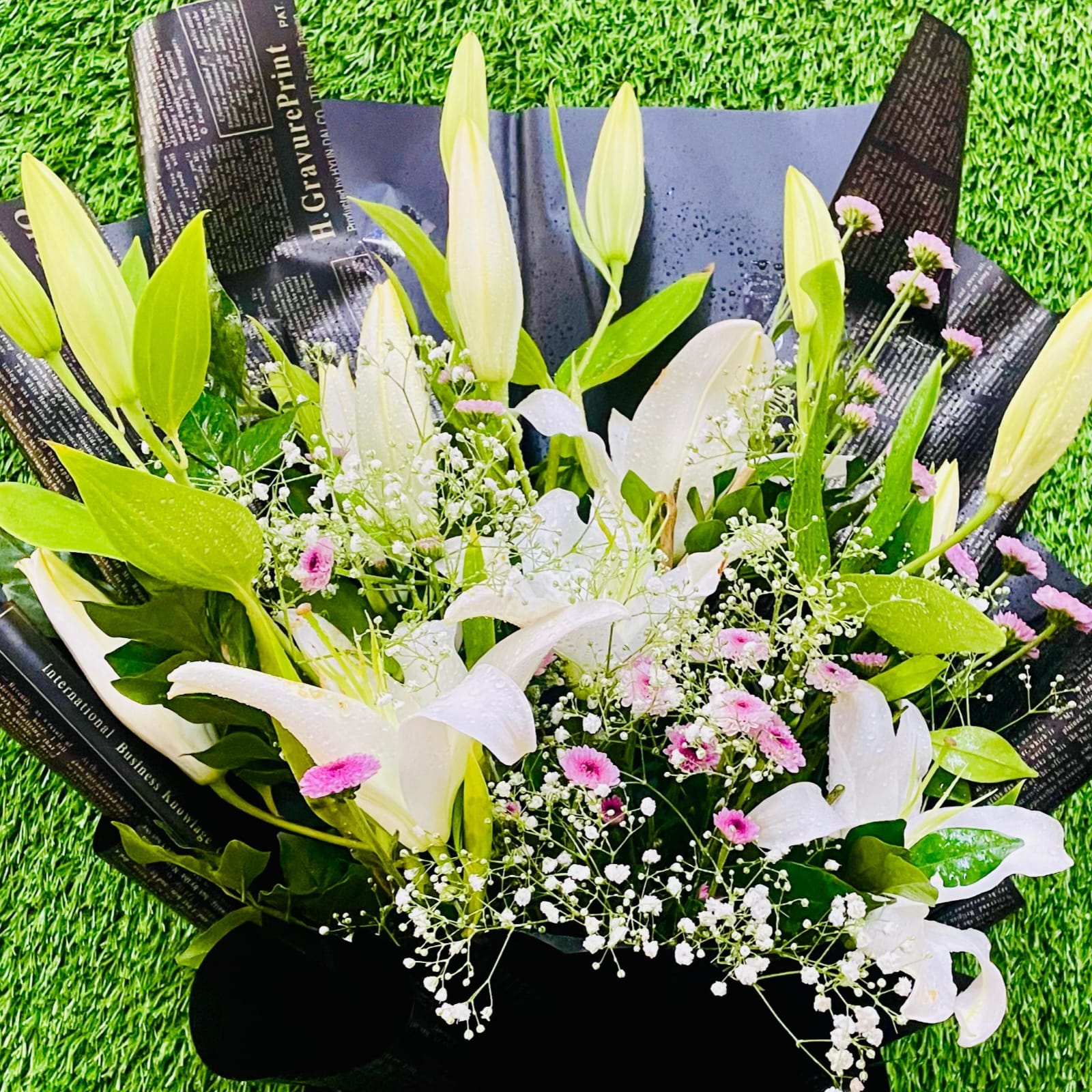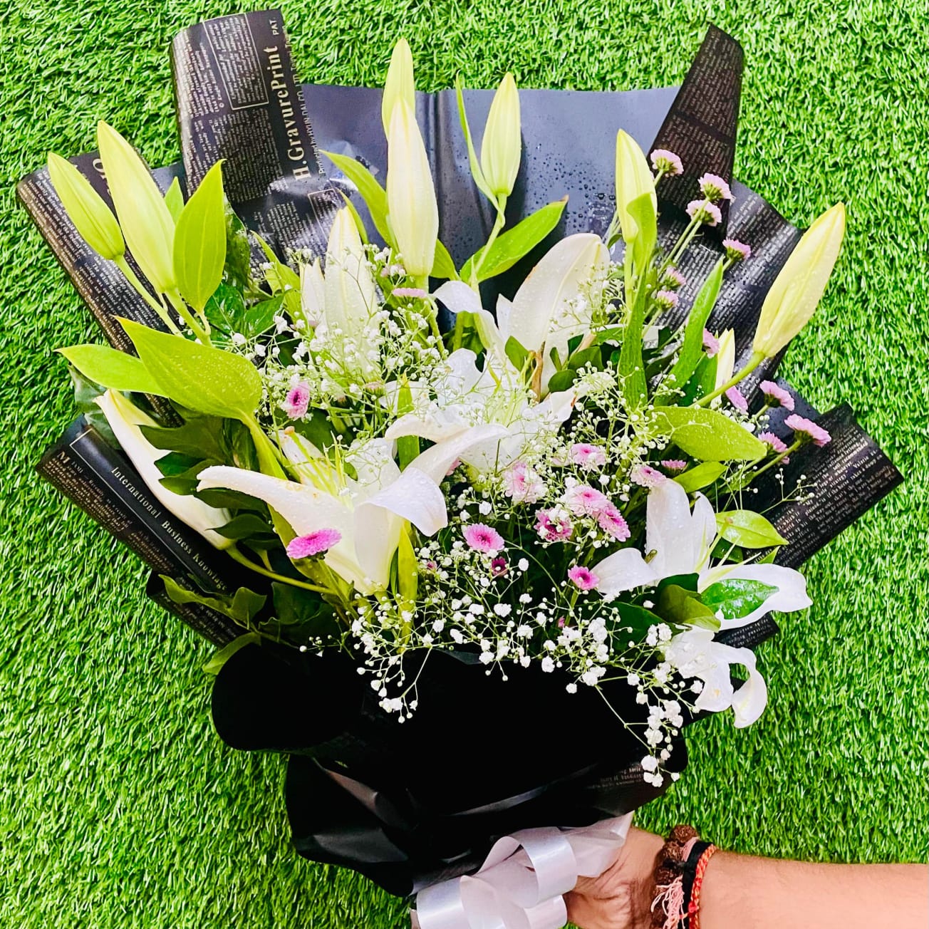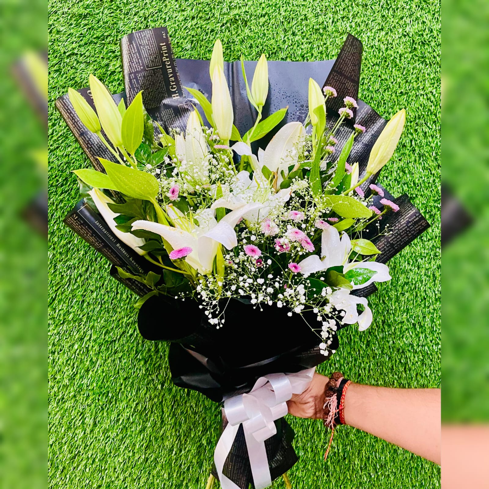 | A Bouquet of Exotic Flower 6 Steam of lily flower 3 Steam of Button daisy flower Additional Flower With Baby Breath Wrapping with Black Korean sheet Tai with flower Ribbon |