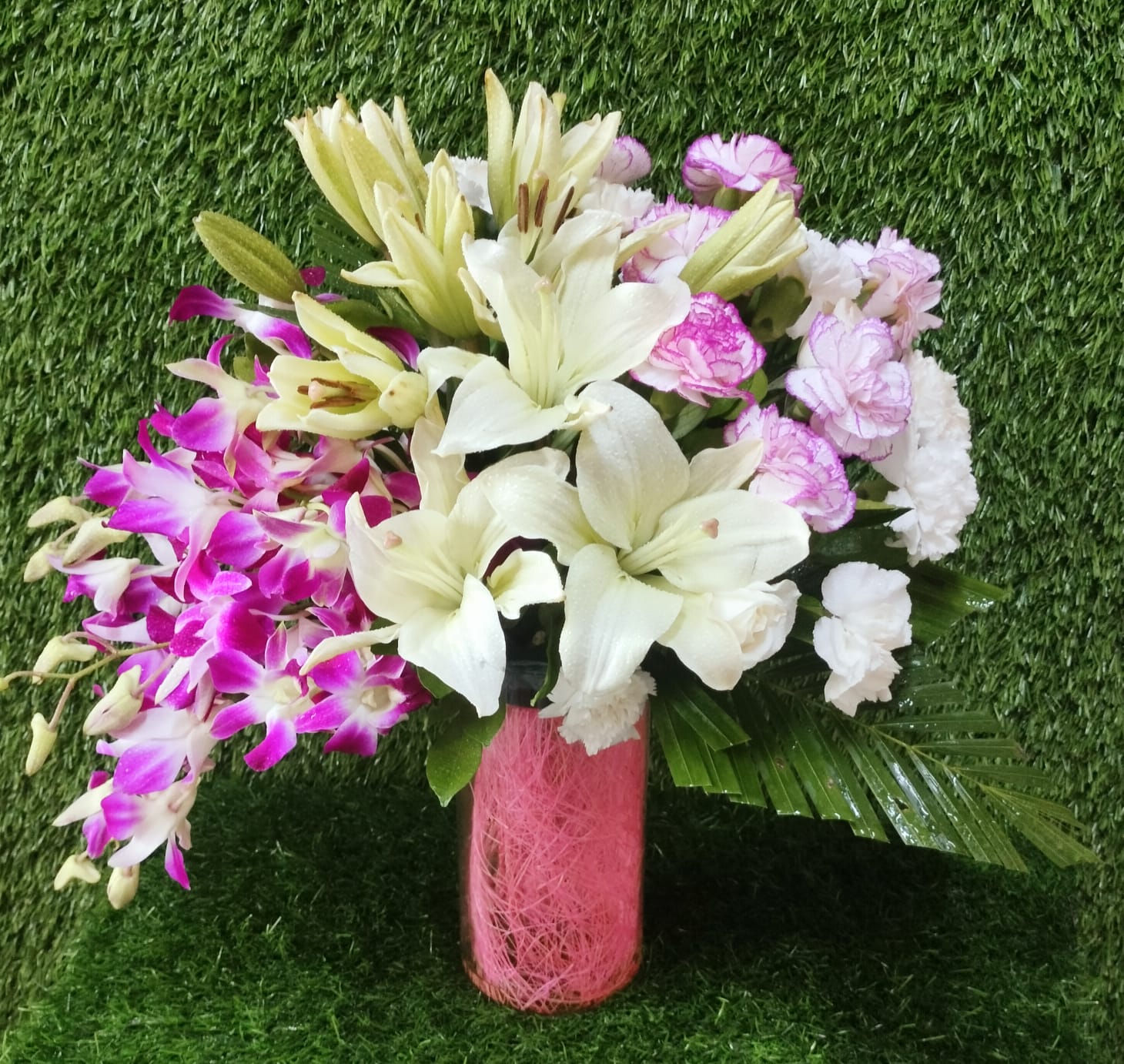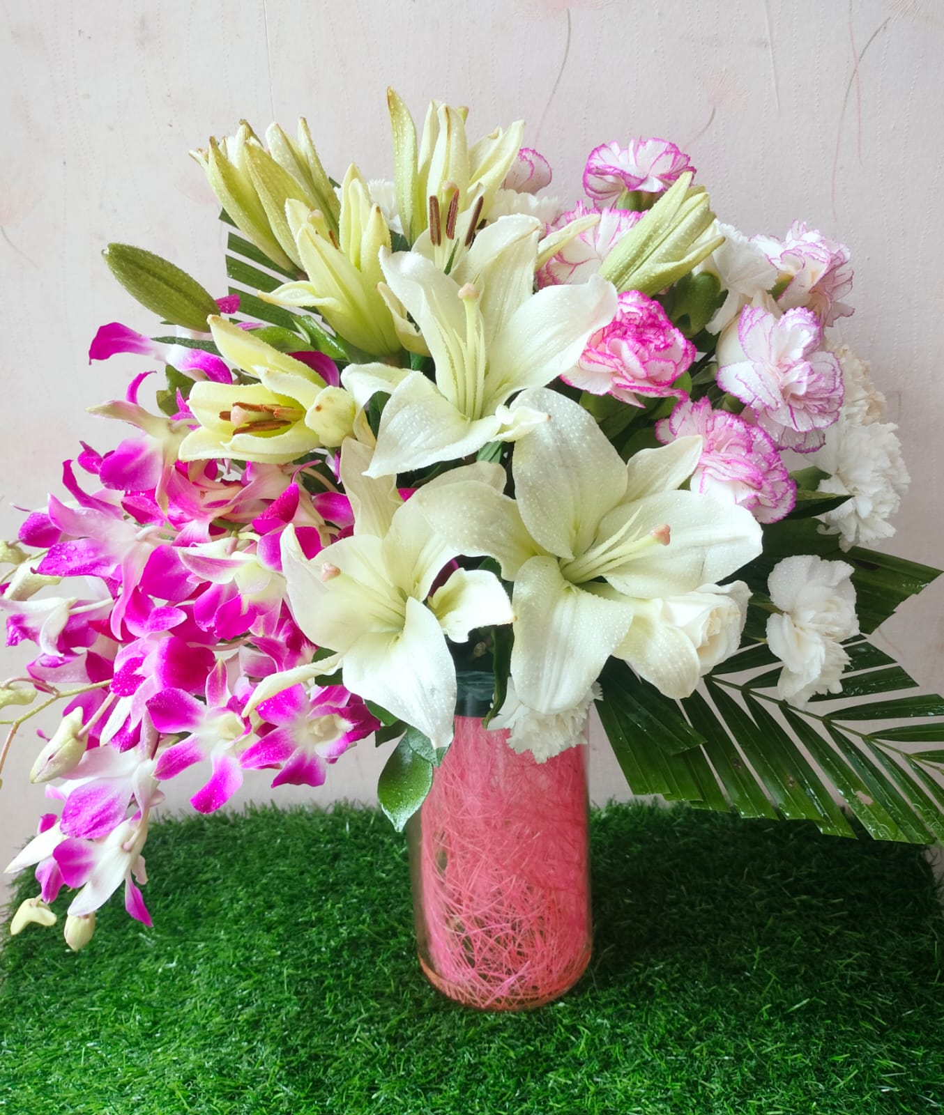 | A Glass Arrangement of Exotic Flower 5 Steam of lily flower 10 steam of carnation 6 Steam of orchid flower Decor With Green leaves A Reusable glass vas