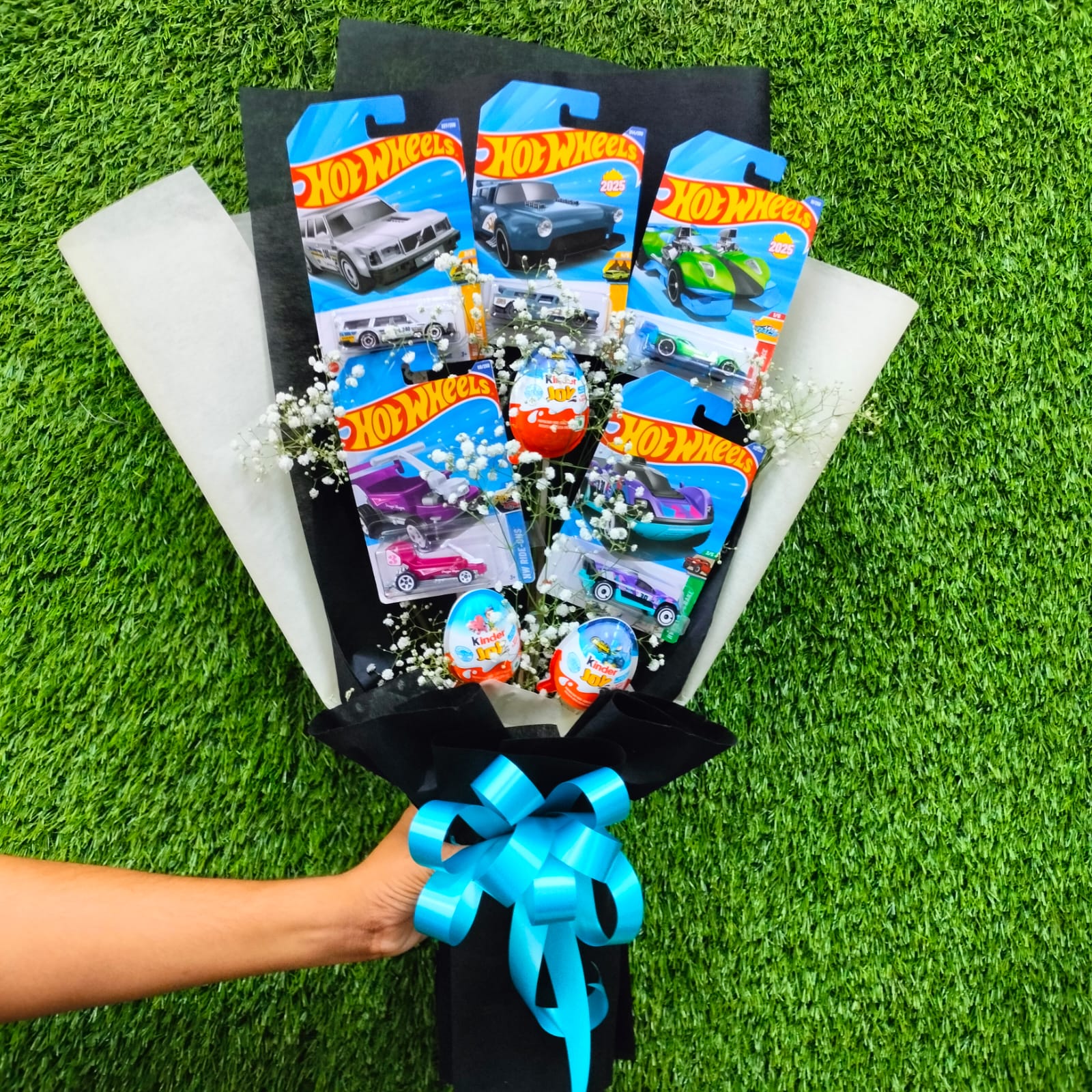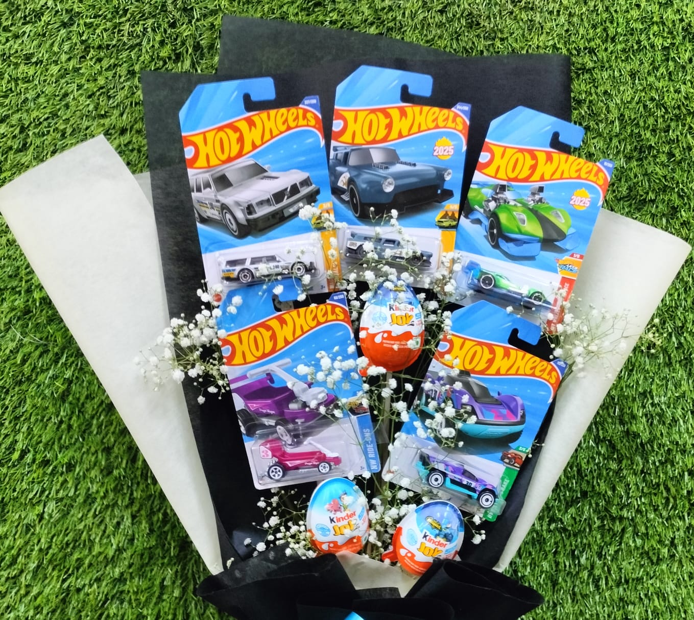“A fun-filled bouquet featuring 5 Hot Wheels cars and 3 Kinder Joy chocolates, stylishly wrapped in elegant black and off-white paper. A perfect blend of speed and sweetness, making it an exciting gift for kids and car lovers.”
