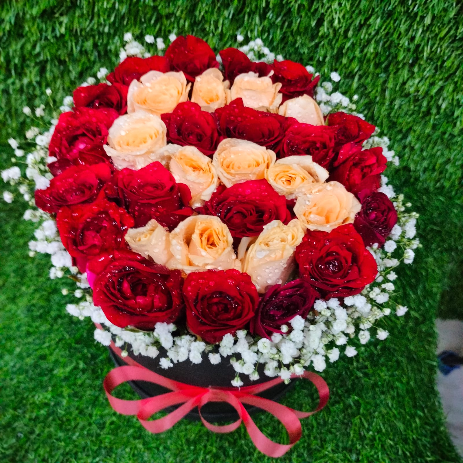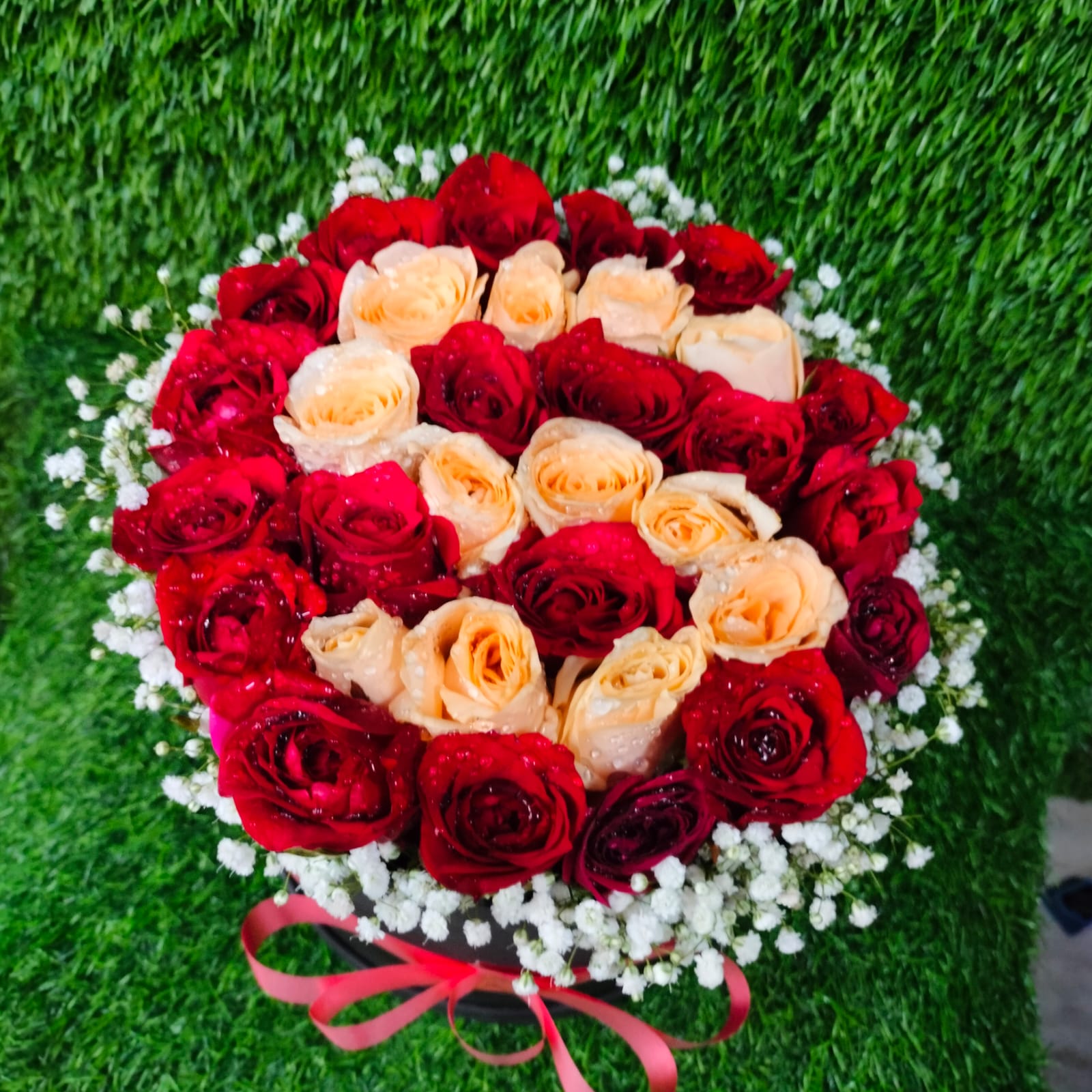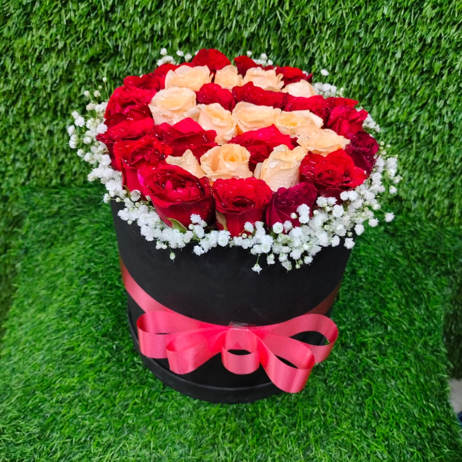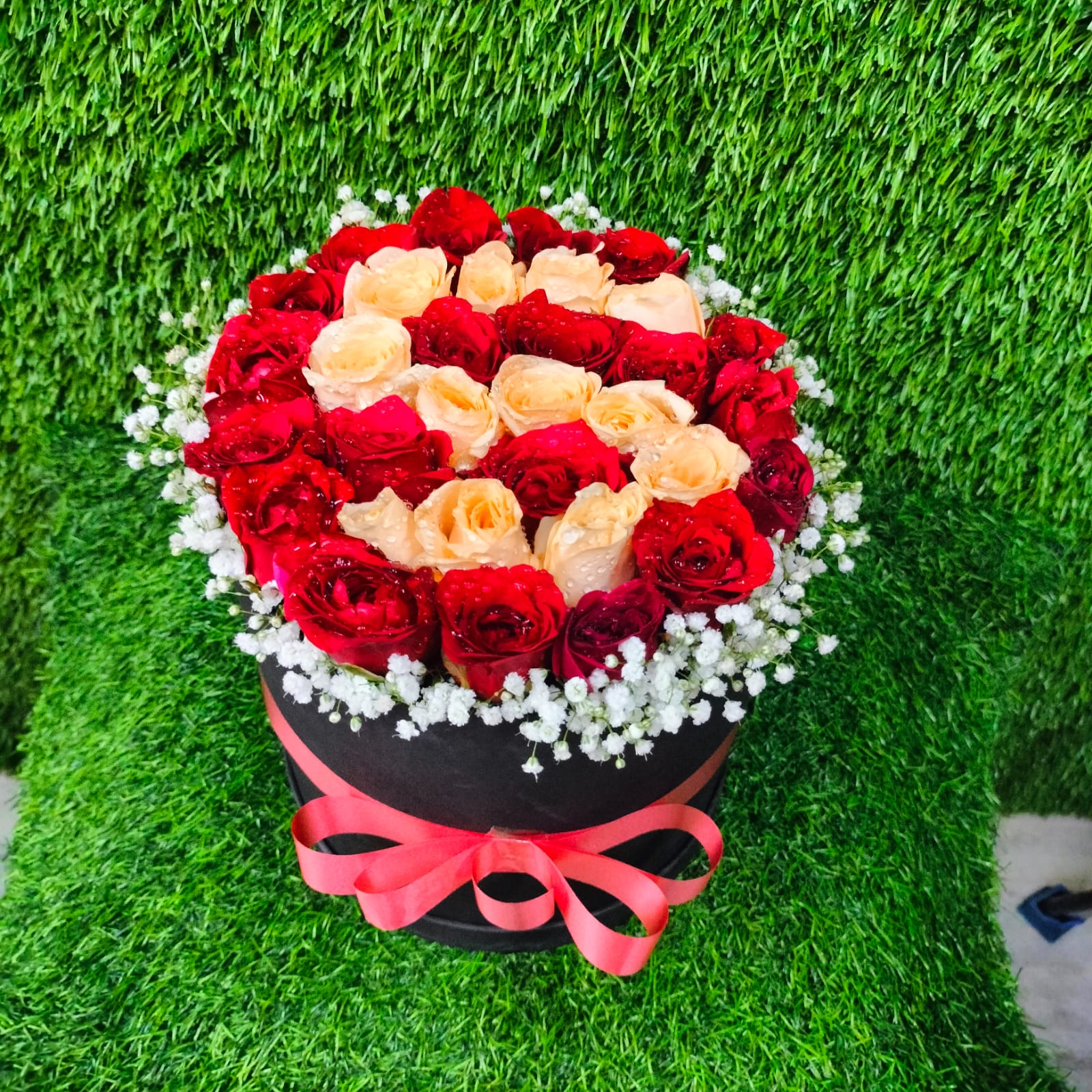 | A Round box Arrangement of Red rose Flower 35 Steam of Roses With alphabet Design ( Customization Available ) A Border of Baby Breath Flower Tai with flower Ribbon A Reusable Box